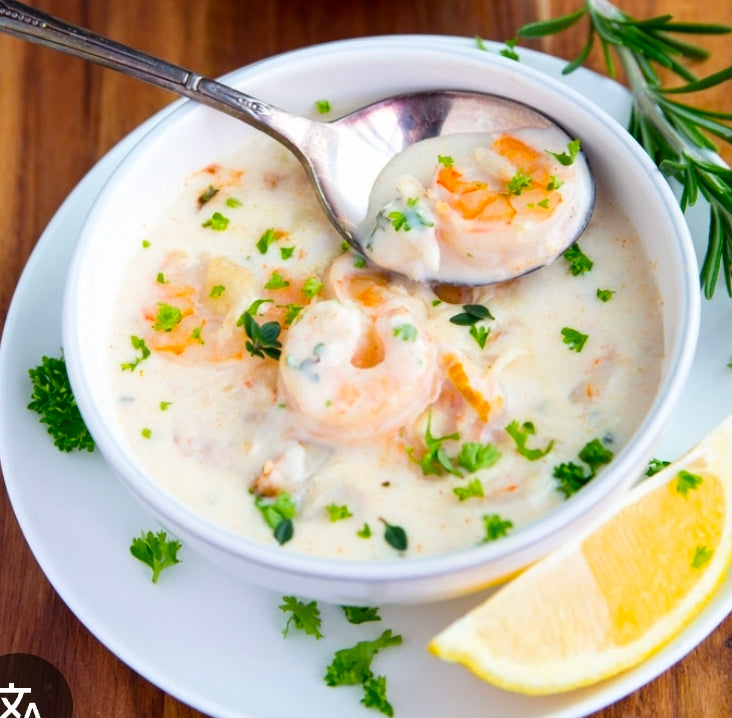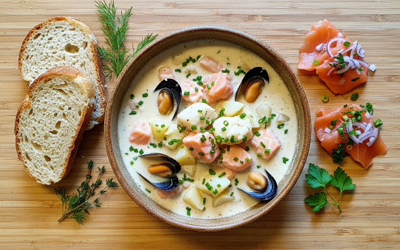 Soupe chaude de truite fumée, haddock, fruits de mer et petits légumes au safran